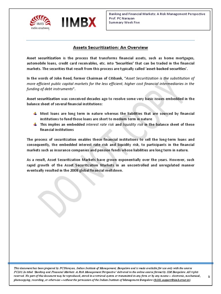 In the words of John Reed, former Chairman of Citibank, Asset Securitization is the substitution of