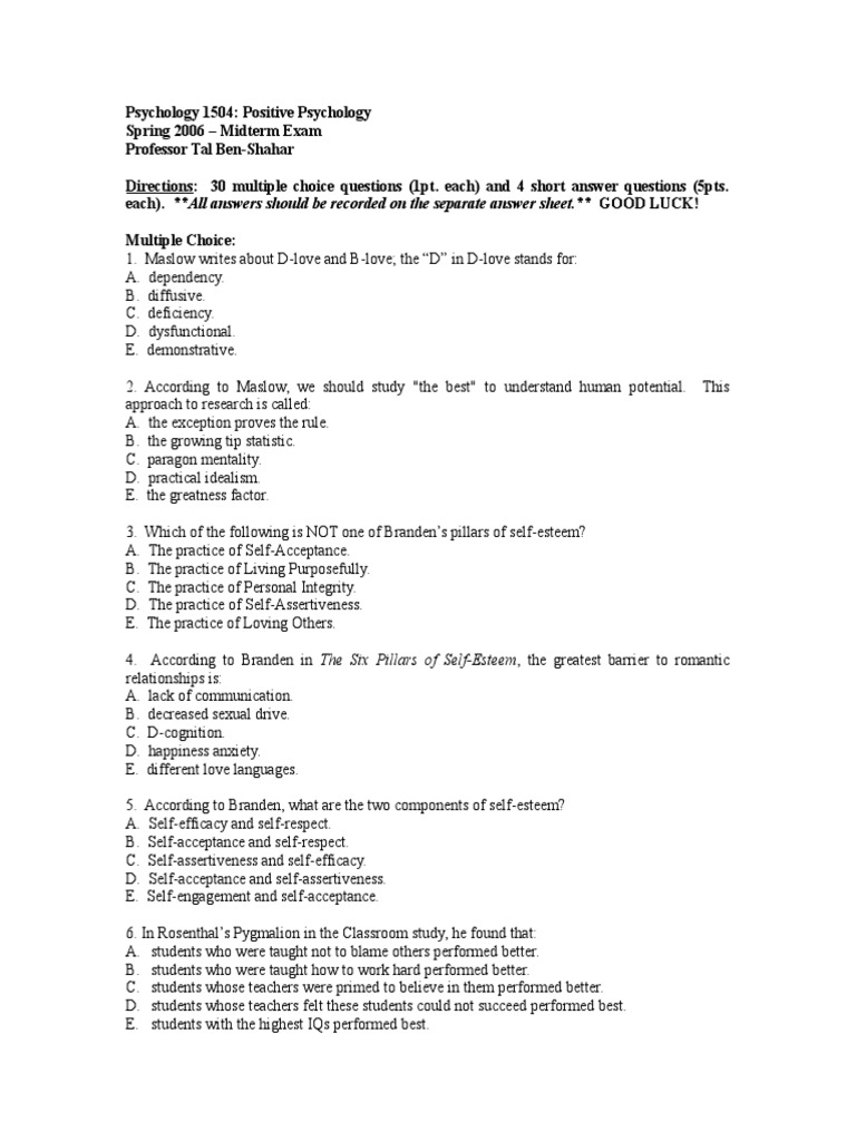 1. Maslow writes about D-love and B-love; the D in D-love stands for: