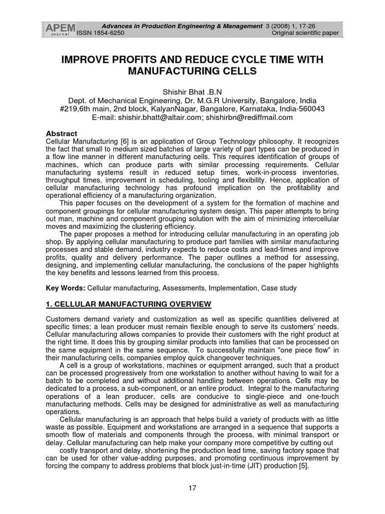 Bhat: Improve Profits and Reduce Cycle Time with Manufacturing Cells
