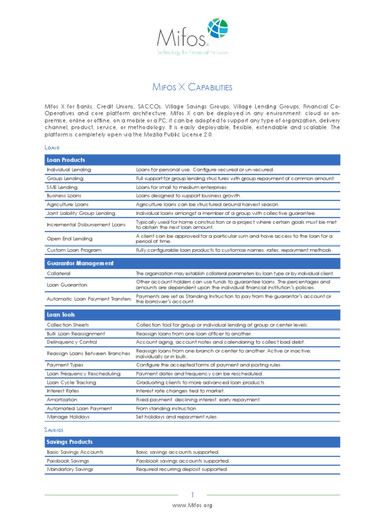 Mifos X for Banks, Credit Unions, SACCOs, Village Savings Groups, Village Lending Groups, Financial CoOperatives and core platform architecture. Mifos X can be deployed in any environment: cloud or onpremise, online or offline, on a mobile or a PC; it can be adopted to support any type of organization, delivery