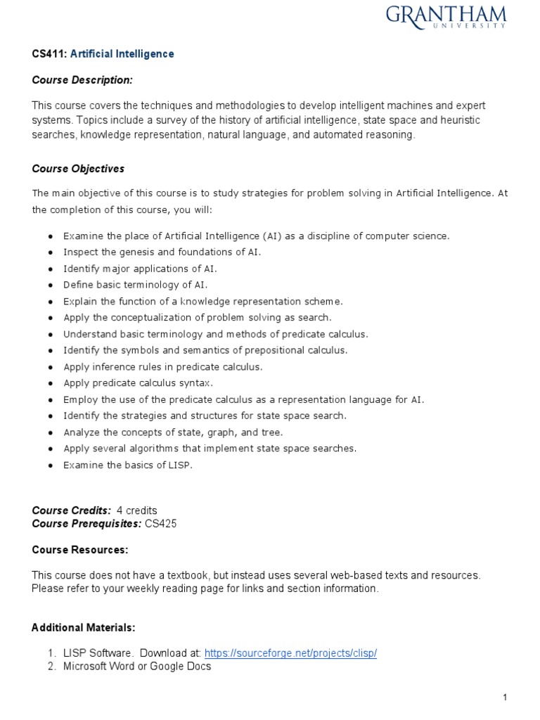 systems. Topics include a survey of the history of artificial intelligence, state space and heuristic