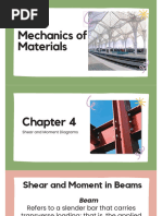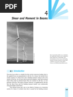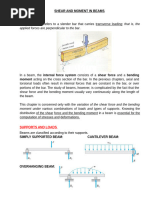 This chapter discusses shear and moment in beams, including that a beam is a bar subjected to forces in the plane containing its longitudinal axis. Beams can be statically determinate or indeterminate depending on their determinacy. It provides examples of shear and moment equations for different beam types under various loadings.