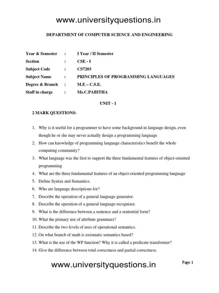 Subject Name : PRINCIPLES OF PROGRAMMING LANGUAGES