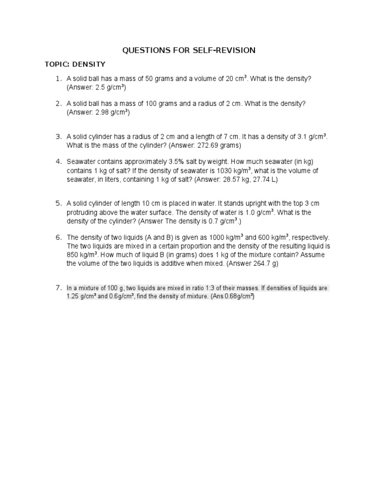 1.25 g/cm3 and 0.6g/cm3, find the density of mixture. (Ans 0.68g/cm 3)