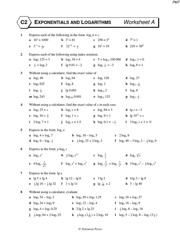 C2 EXPONENTIALS AND LOGARITHMS Worksheet A