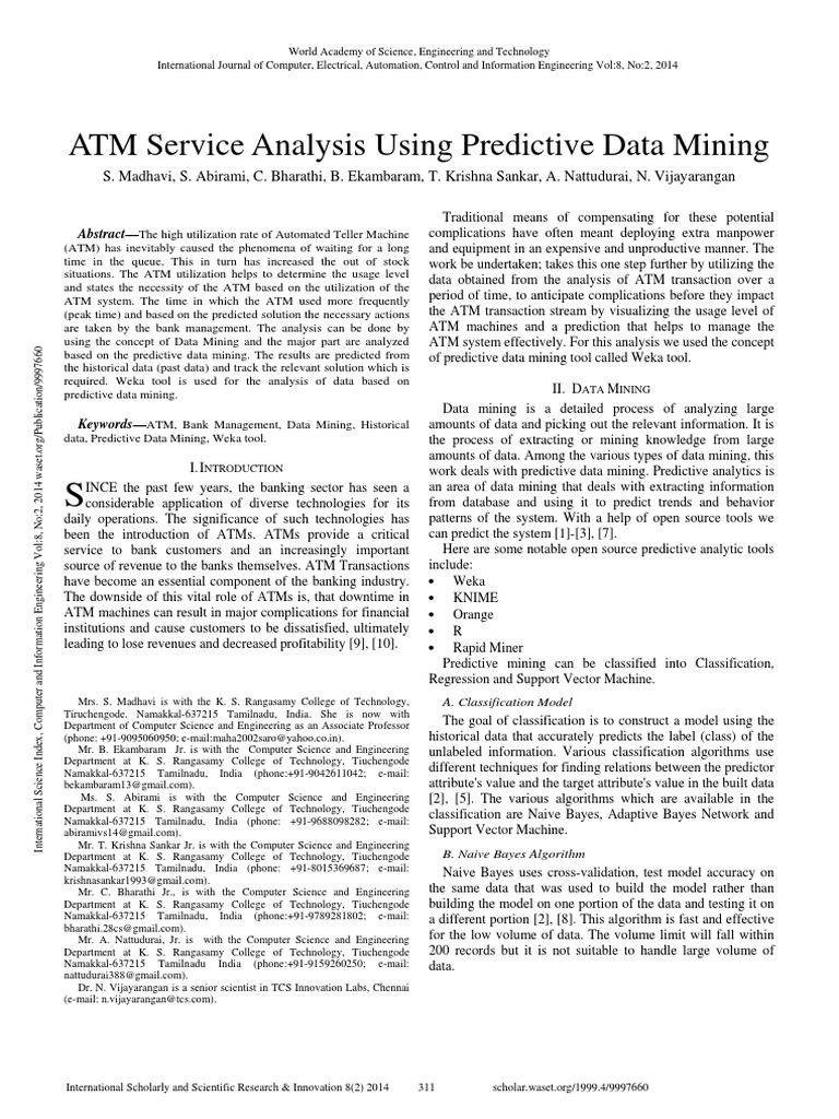 KeywordsATM, Bank Management, Data Mining, Historical amounts of data and picking out the relevant information. It is