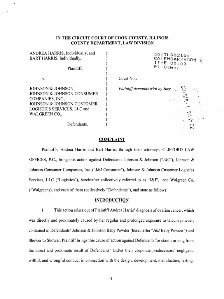 1. This action arises out of Plaintiff Andrea Harris diagnosis of ovarian cancer, which