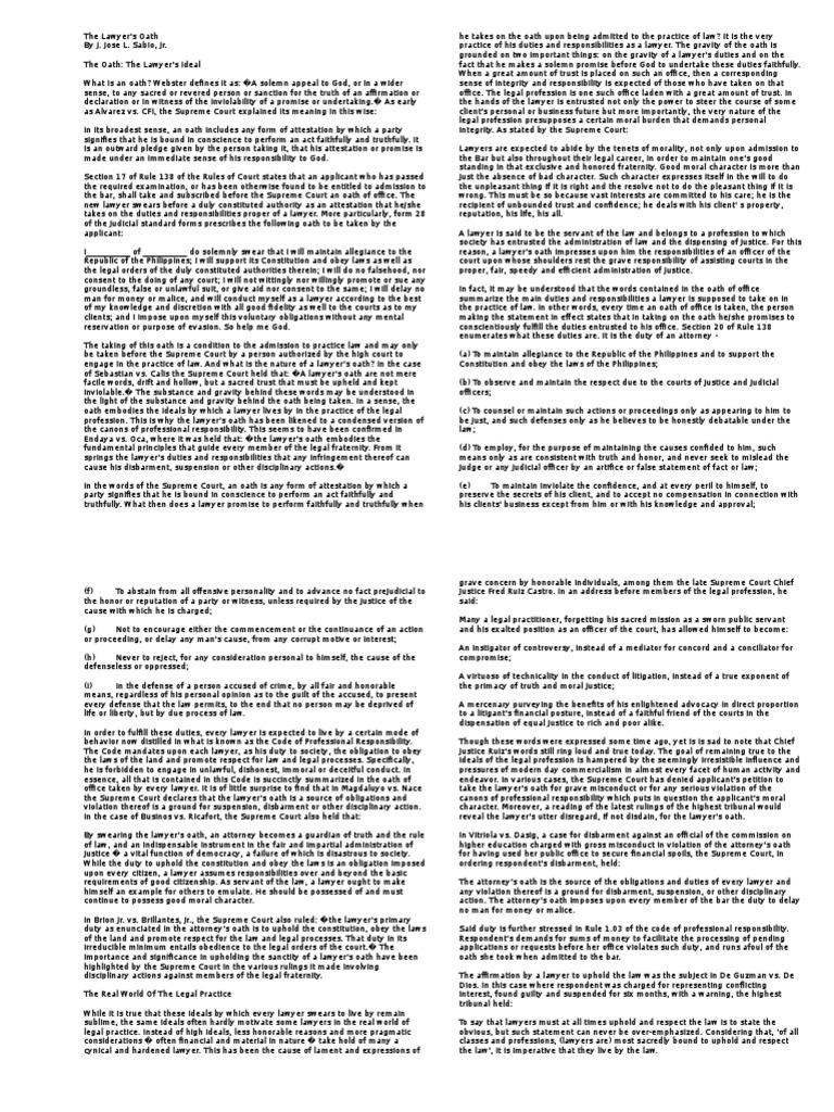 is an outward pledge given by the person taking it, that his attestation or promise is Lawyers are expected to abide by the tenets of morality, not only upon admission to