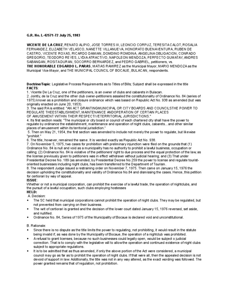 1. Vicente De La Cruz, one of the petitioners, is an owner of clubs and cabarets in Bulacan.