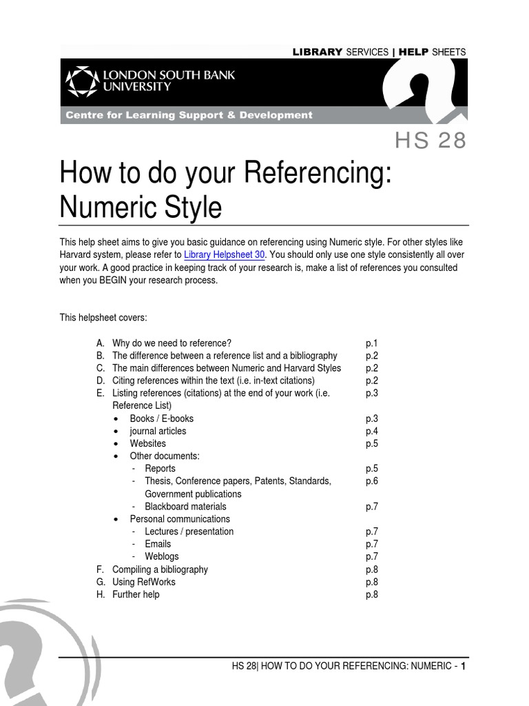 This help sheet aims to give you basic guidance on referencing using Numeric style. For other styles like