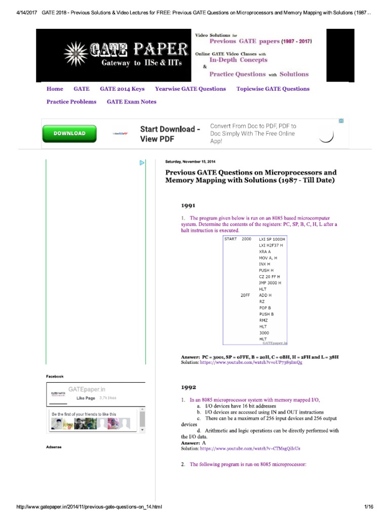 iipdhwwra gatepape.in-20tprevius-gale-questors-on_14himl wie{4142017 GATE 2018- Previous Solisions& Video Lectwres for FREE: Previous GATE Questions on Microprocessers and Memory Mapping with Soliuions (1987