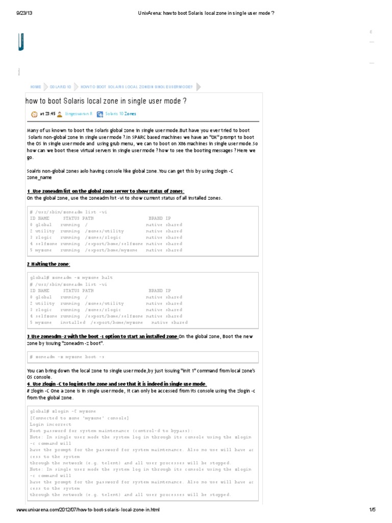 9/23/13 UnixArena: how to boot Solaris local zone in single user mode ?