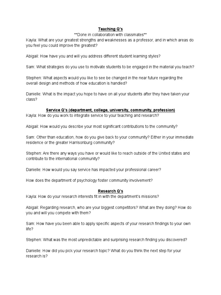 questions for the professors present to detail their thoughts on teaching, research, and service.