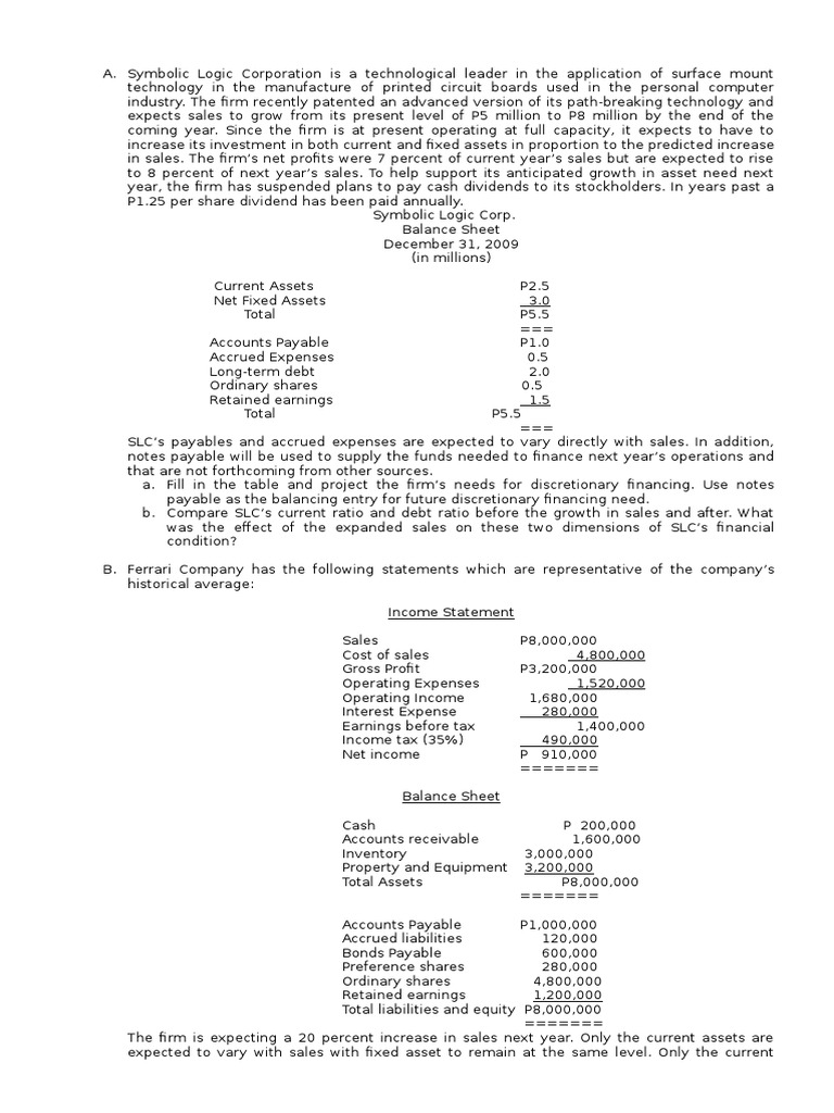 1. For next year (2010), the company expects sales to increase by 15%. Only current assets and
