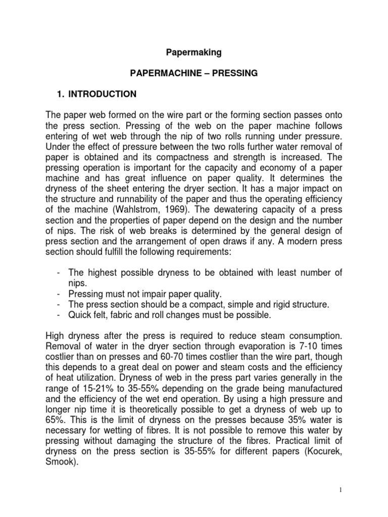 dryness on the press section is 35-55% for different papers (Kocurek,