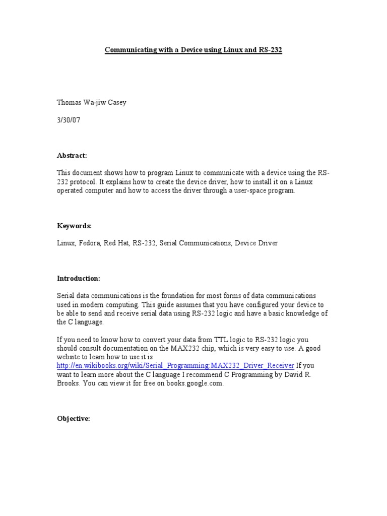 232 protocol. It explains how to create the device driver, how to install it on a Linux