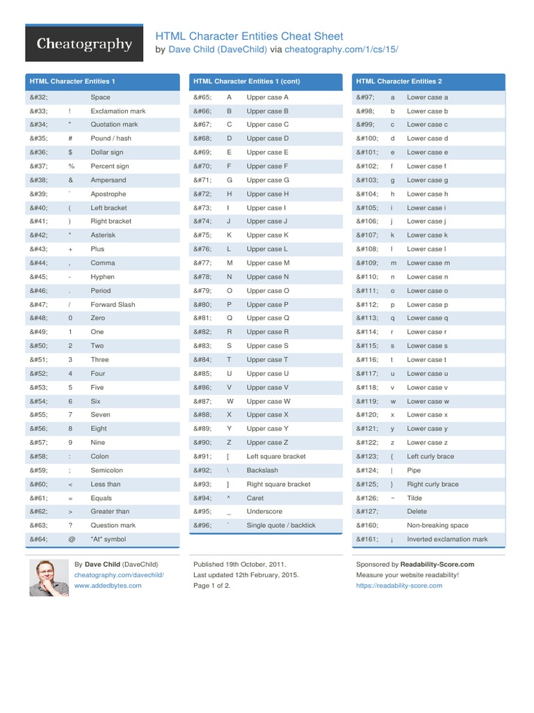 HTML Character Entities Cheat Sheet