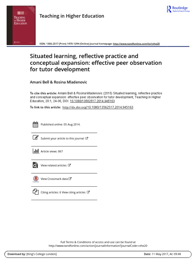 To cite this article: Amani Bell & Rosina Mladenovic (2015) Situated learning, reflective practice
