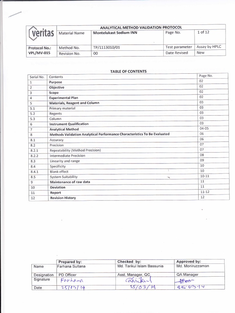 ANALYTICAL M ETHOD VALIDATION PROTOCOL