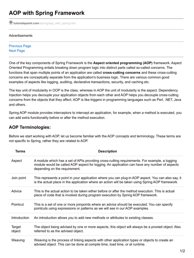 One of the key components of Spring Framework is the Aspect oriented programming (AOP) framework. Aspect