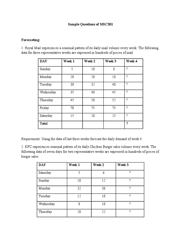 2. KFC experiences seasonal pattern of its daily Chicken Burger sales volume every week. The