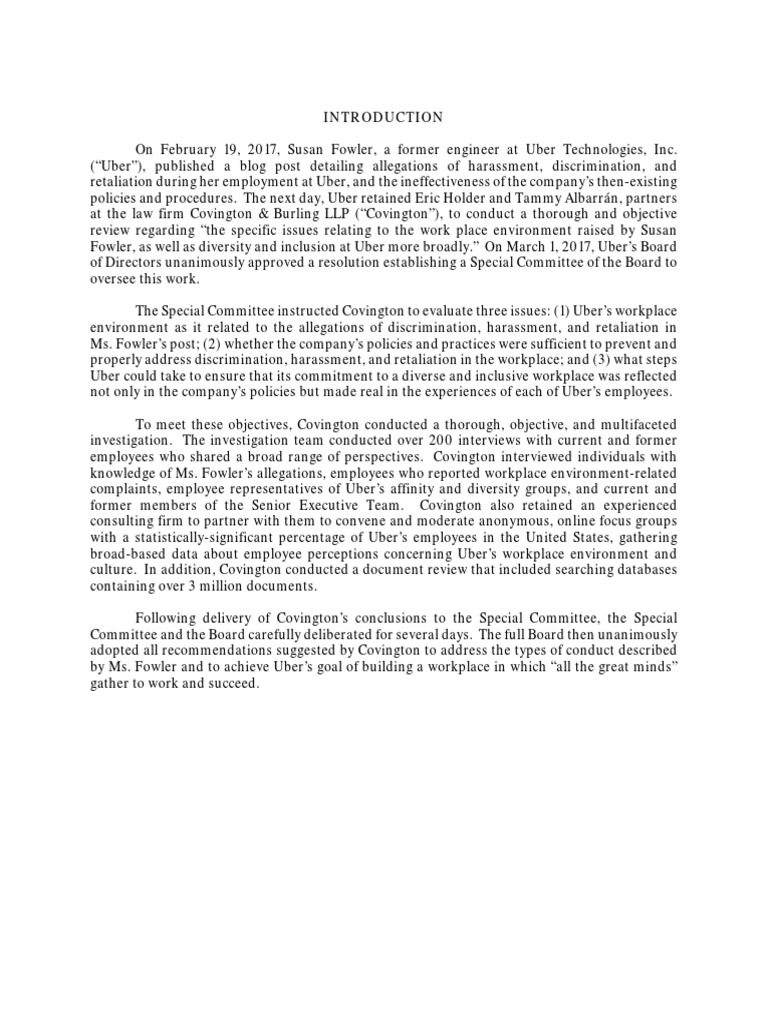 The Special Committee instructed Covington to evaluate three issues: (1) Ubers workplace