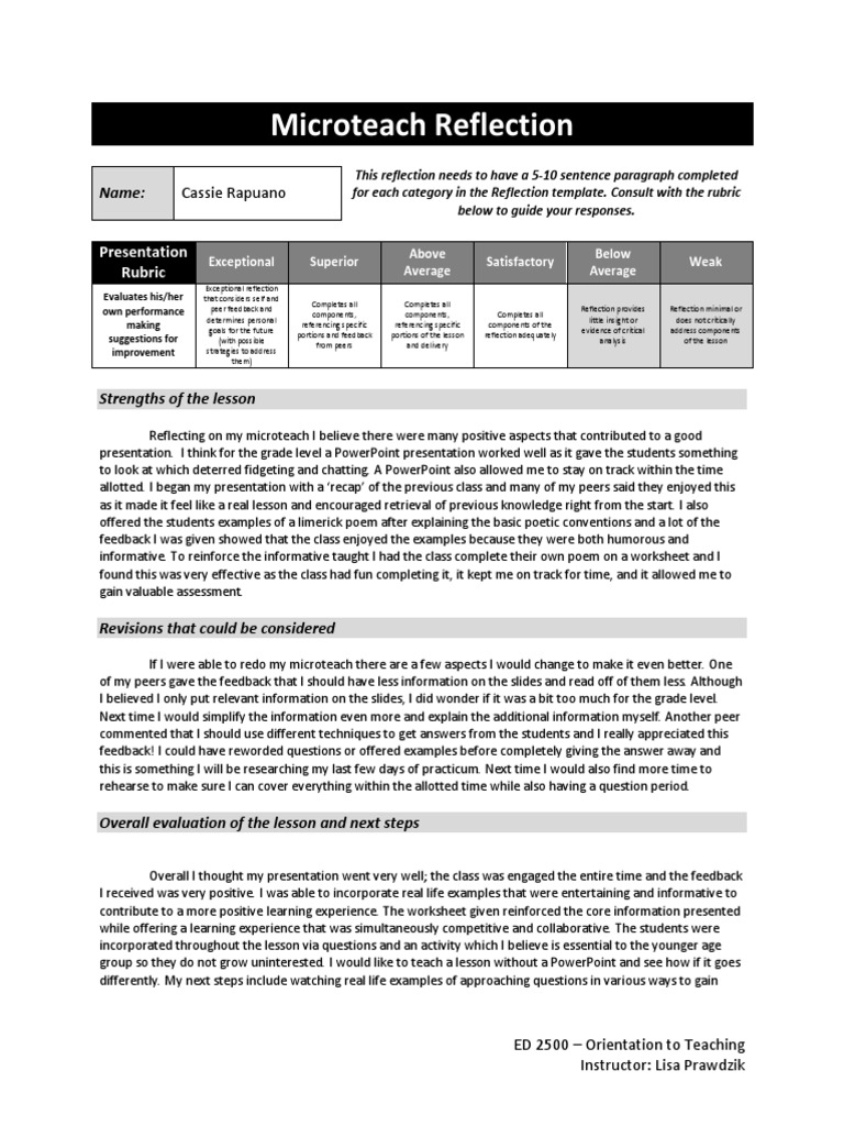 Name: Cassie Rapuano for each category in the Reflection template. Consult with the rubric