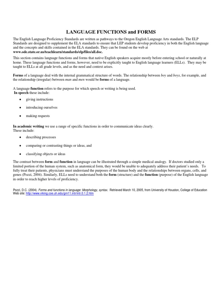 genes (Pozzi, 2004). Similarly, ELLs need to understand both the form (structure) and the function (purpose) of the English language