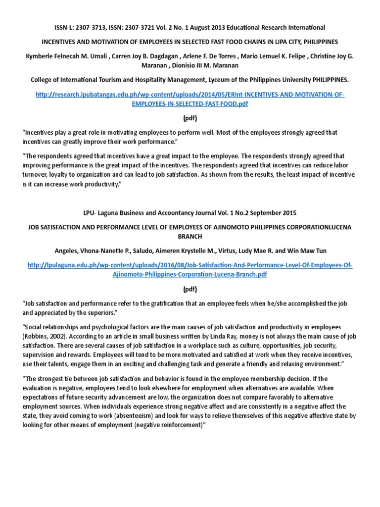 INCENTIVES AND MOTIVATION OF EMPLOYEES IN SELECTED FAST FOOD CHAINS IN LIPA CITY, PHILIPPINES