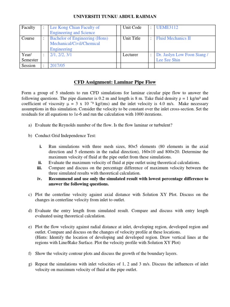 Form a group of 5 students to run CFD simulations for laminar circular pipe flow to answer the