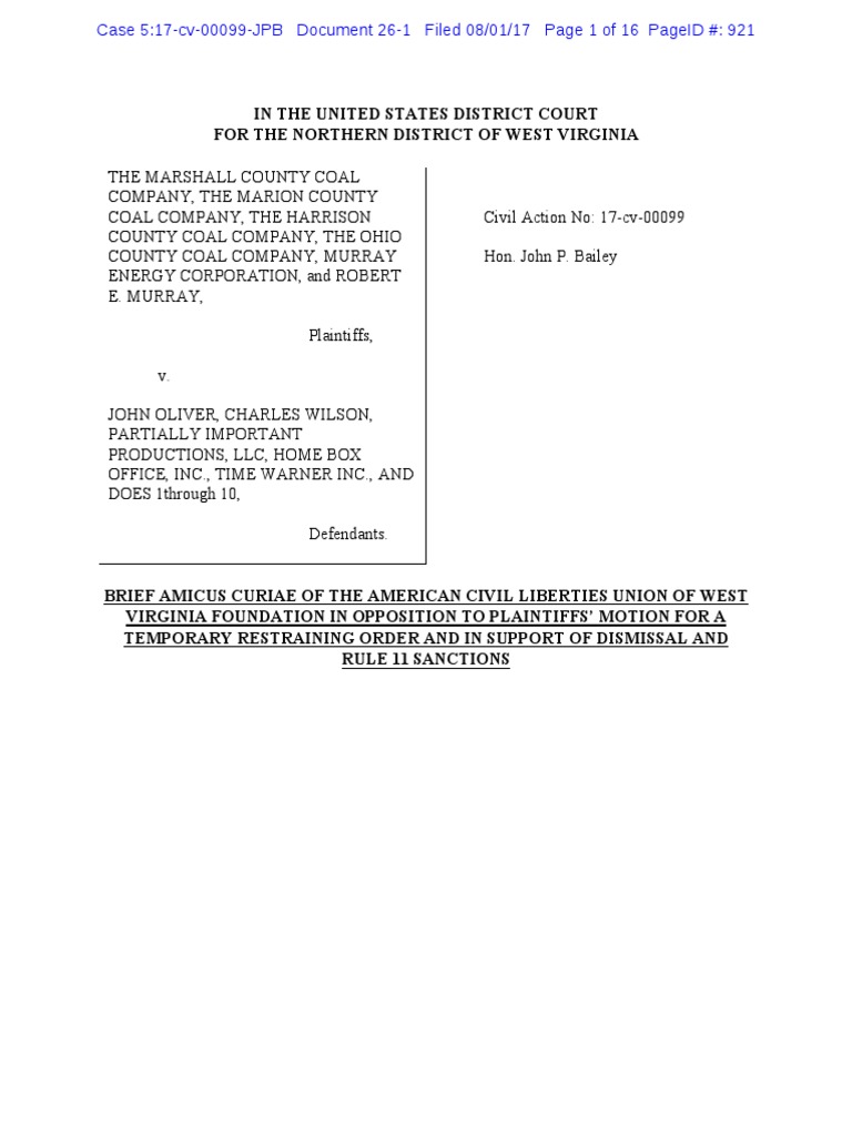 Virginia Foundation (ACLU-WV) respectfully requests the Court deny Plaintiffs Motion for a