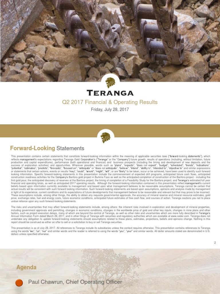 This presentation is as of July 28, 2017. All references to Teranga include its subsidiaries unless the context requires otherwise. This presentation contains references to Teranga