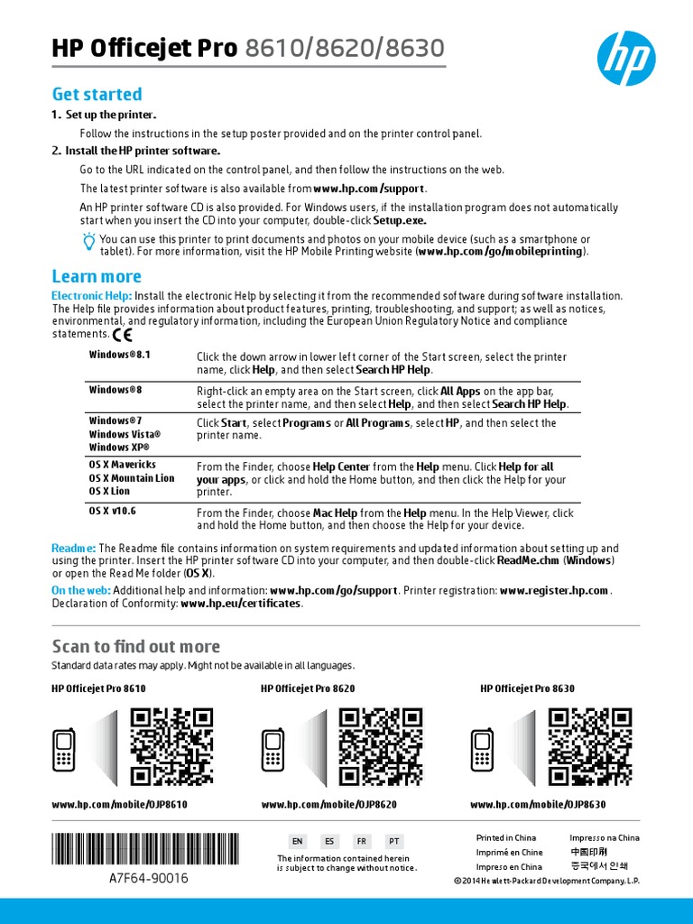 On the web: Additional help and information: www.hp.com/go/support. Printer registration: www.register.hp.com.