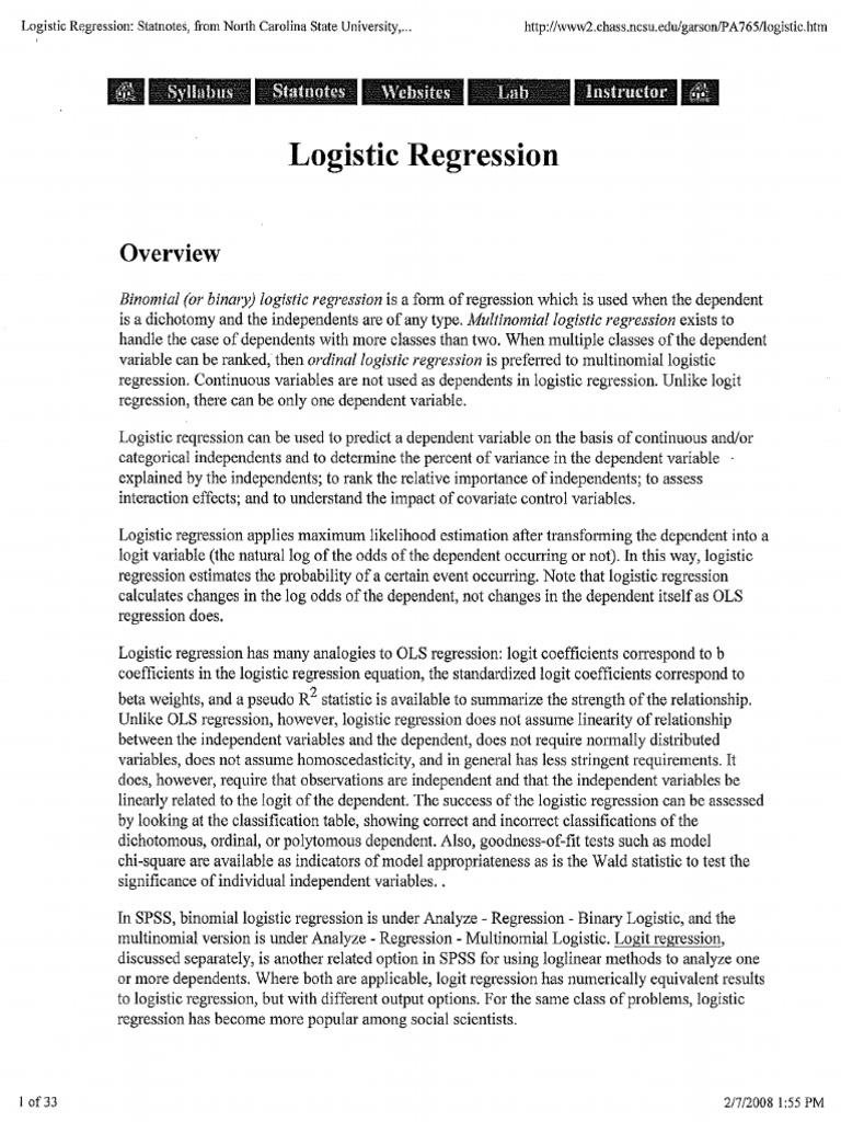 320f33 2/7/2008 1:55 PM.Logistic Regression: Statnotes, from North Carolina State University. http:/hvww2.chass.nesu.edu/garson/PAT6S/logistic htm