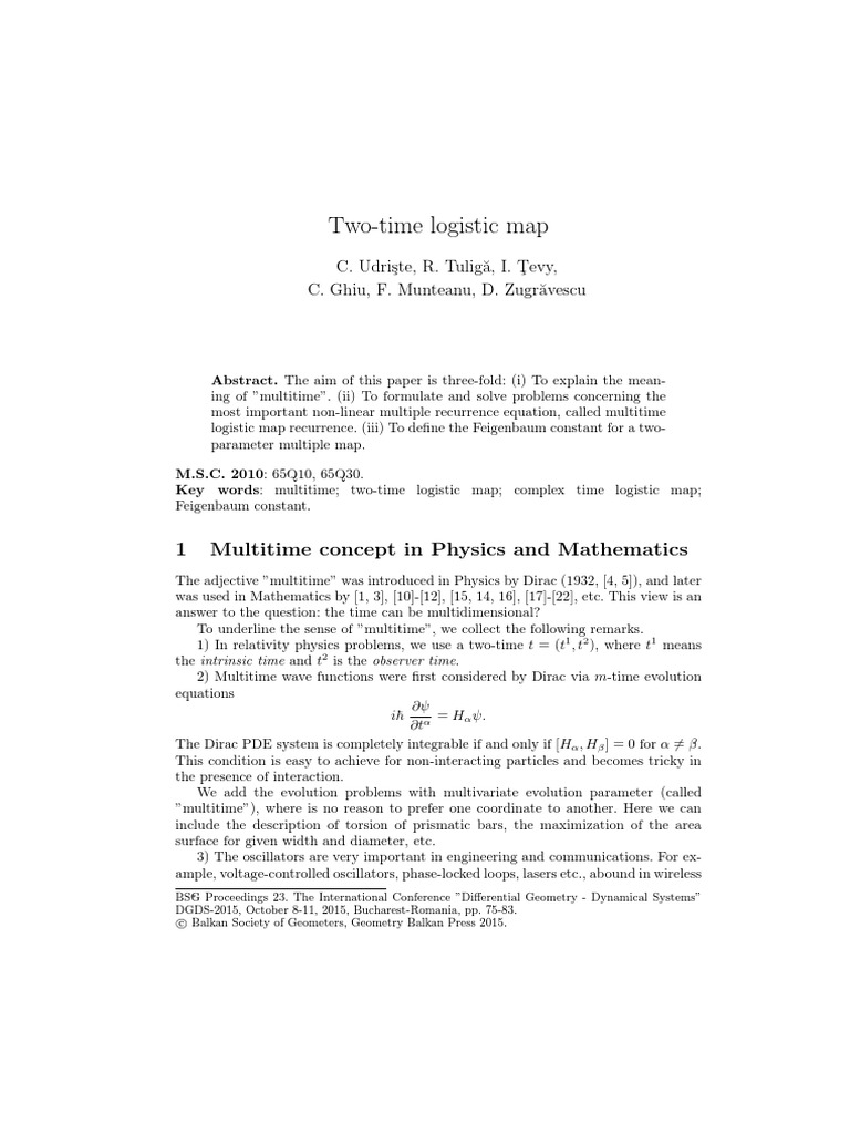 Key words: multitime; two-time logistic map; complex time logistic map;