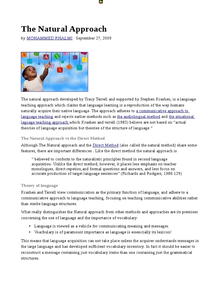 The natural approach developed by Tracy Terrell and supported by Stephen Krashen, is a language
