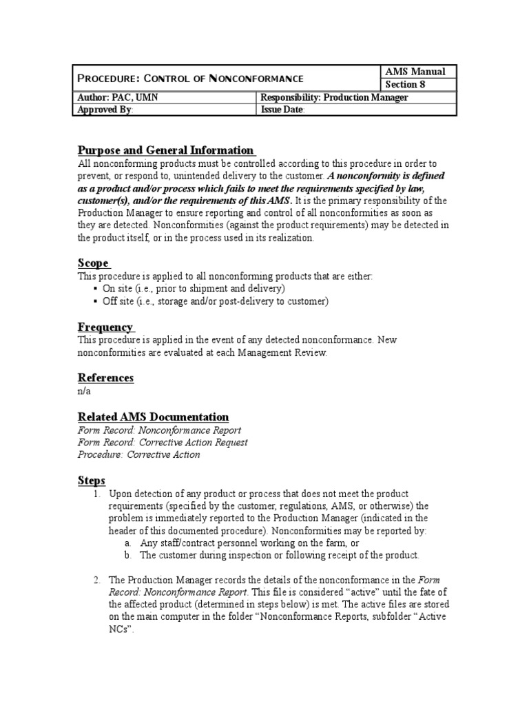 Related AMS Documentation: Procedure: Control of Nonconformance