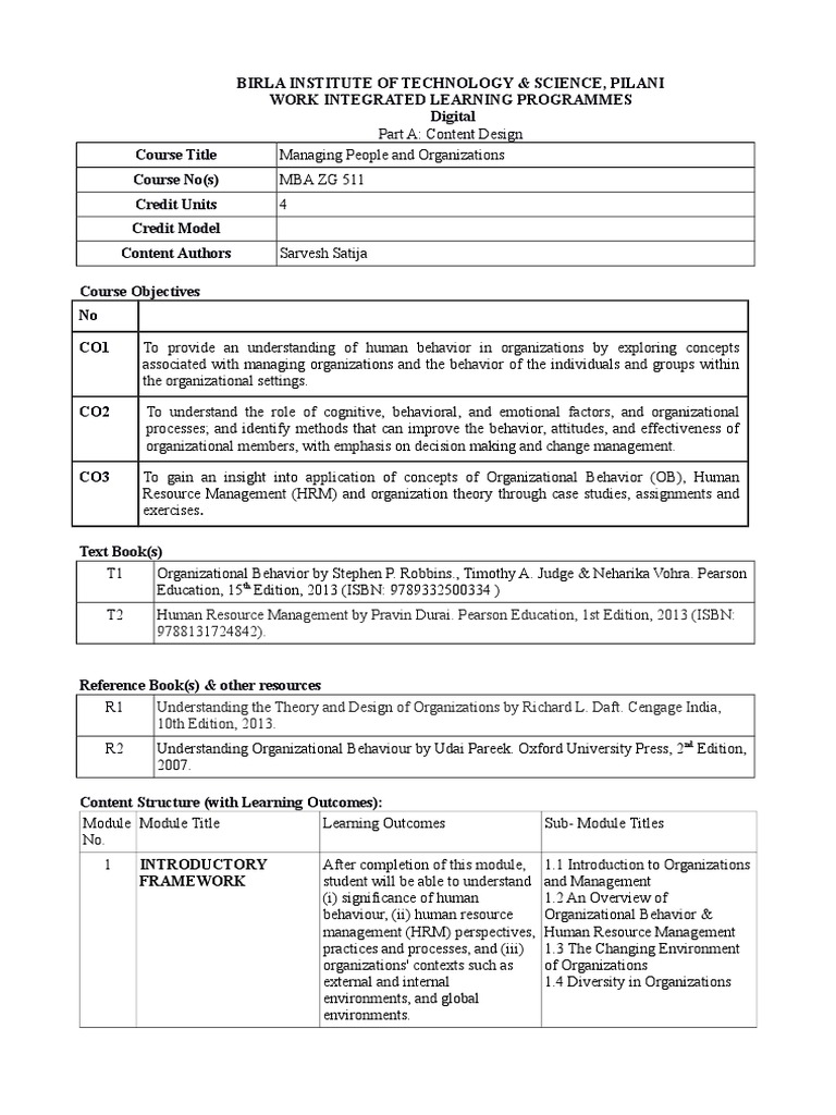 CO1 To provide an understanding of human behavior in organizations by exploring concepts