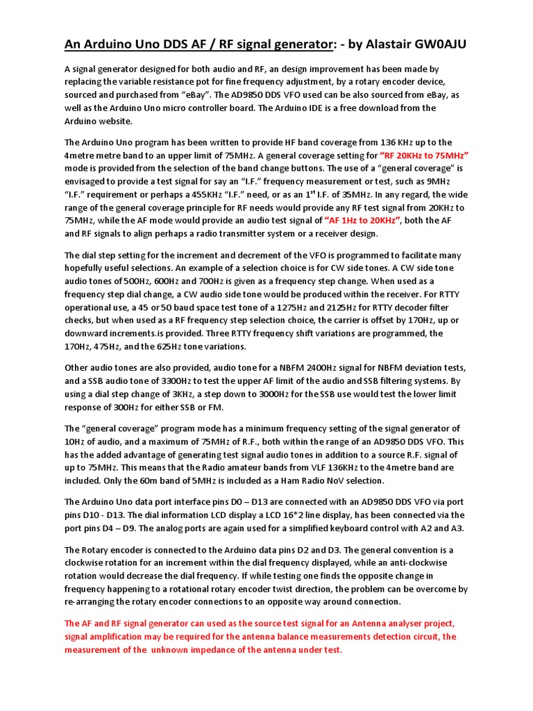 An Arduino Uno DDS AF / RF signal generator: - by Alastair GW0AJU