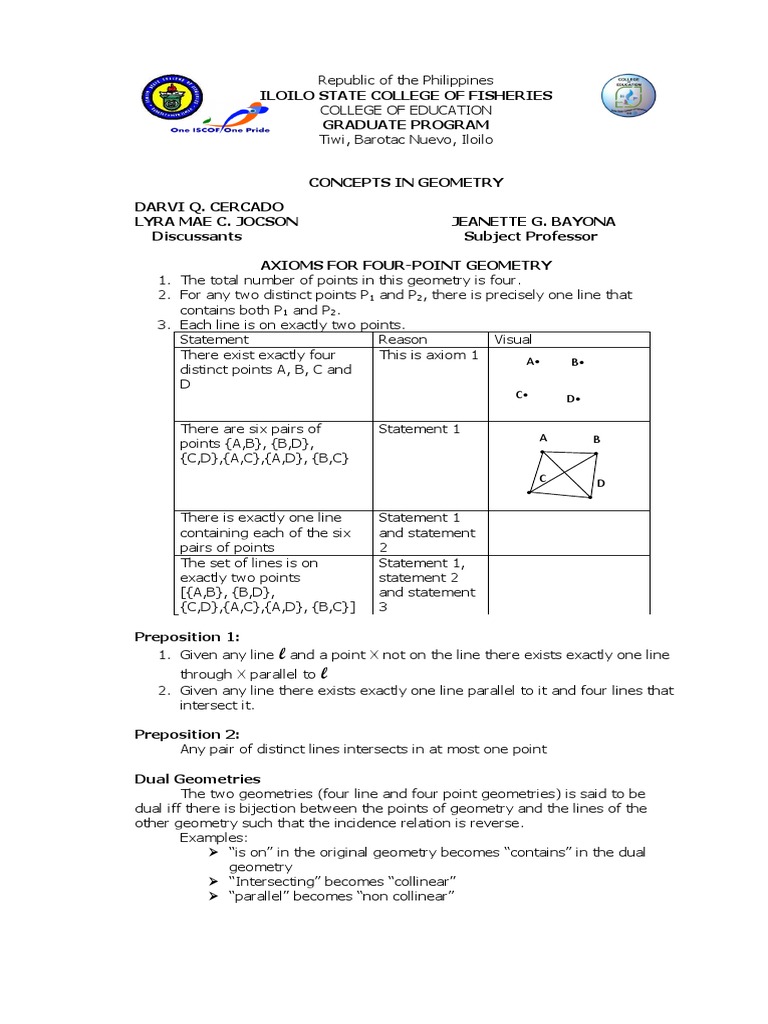 axiom to the system. FOUR-POINT GEOMETRY Axioms There exists exactly four points.