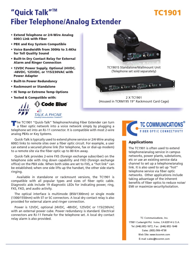 T he TC1901 Quick-Talk Telephone/Analog Fiber Extender can turn