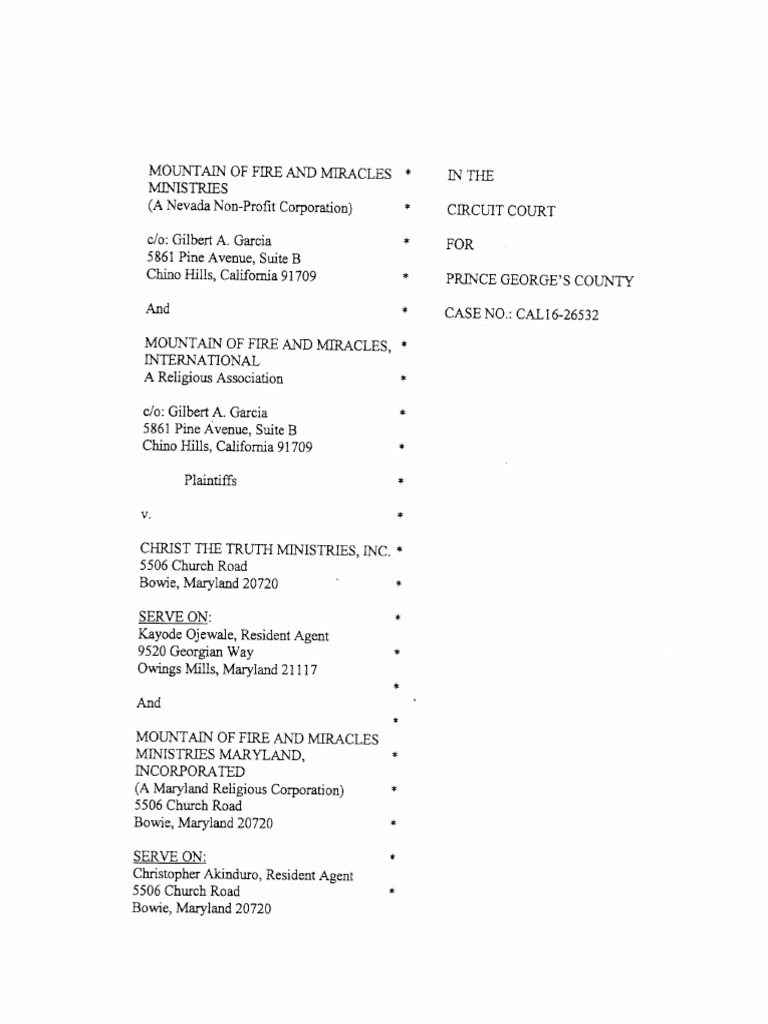.Plaintift and Petitioners, MolrNTAsi oF FIRE AND MIRACLES MINISTRES