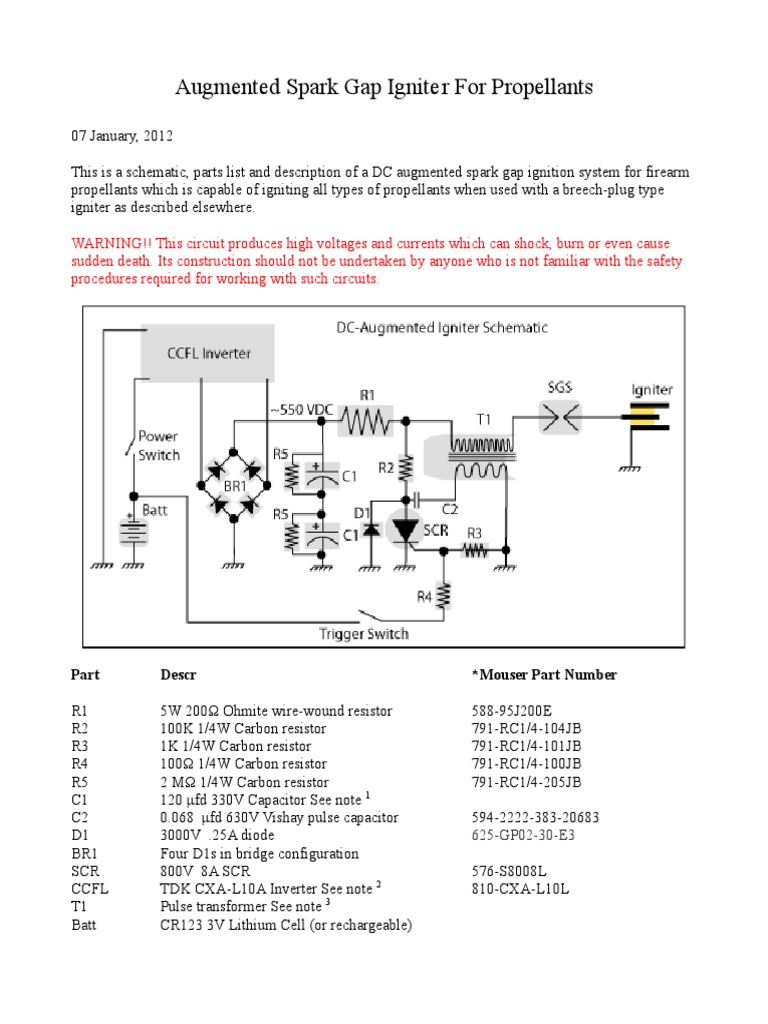 This is a schematic, parts list and description of a DC augmented spark gap ignition system for firearm