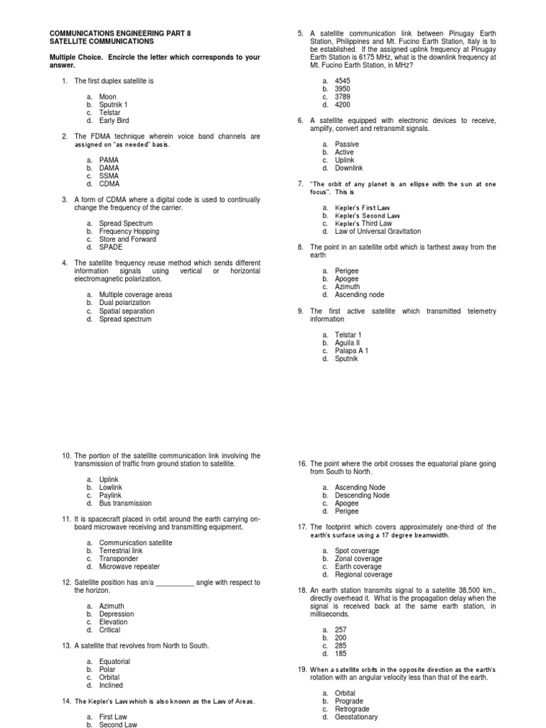 35. What is the basic function of a communications satellite? 40. How do we measure the position of a satellite?