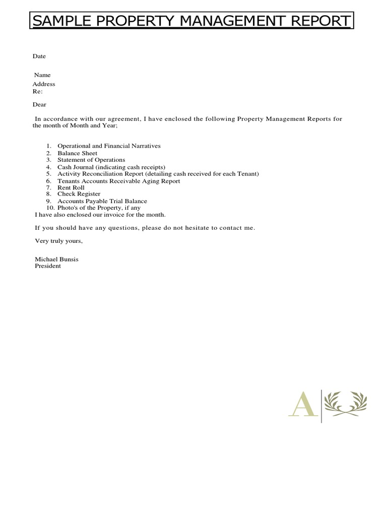 In accordance with our agreement, I have enclosed the following Property Management Reports for