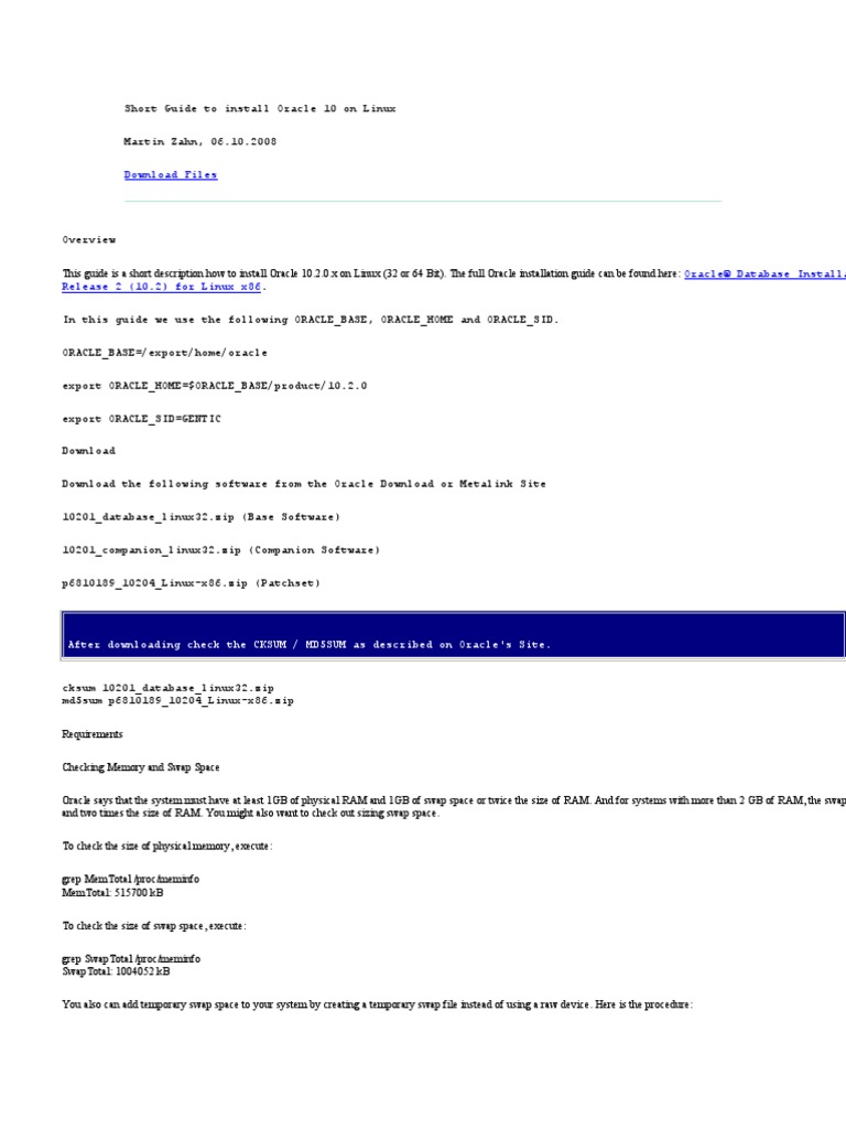 This guide is a short description how to install Oracle 10.2.0.x on Linux (32 or 64 Bit). The full Oracle installation guide can be found here: Oracle® Database Installa