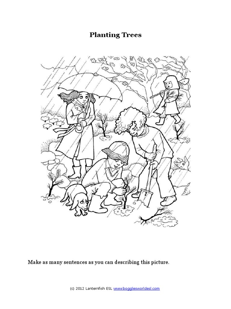 This document discusses planting trees. It shows a picture of a person planting a young tree in the ground. The picture aims to encourage writing multiple sentences to describe the image of someone engaged in the activity of planting a tree.