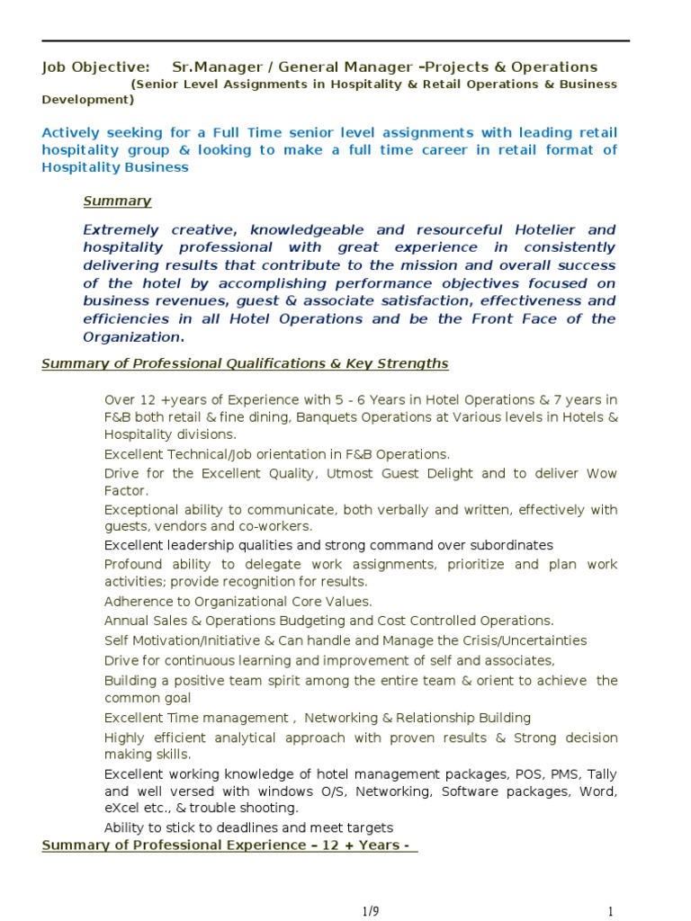 Over 12 +years of Experience with 5 - 6 Years in Hotel Operations & 7 years in