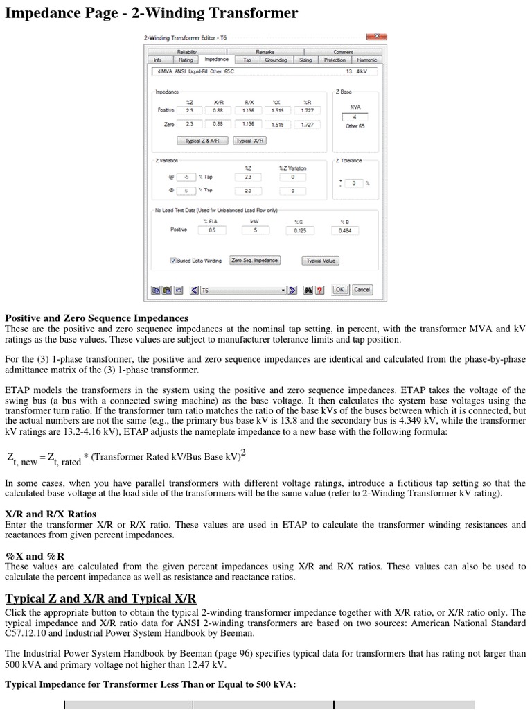 kV ratings are 13.2-4.16 kV), ETAP adjusts the nameplate impedance to a new base with the following formula: