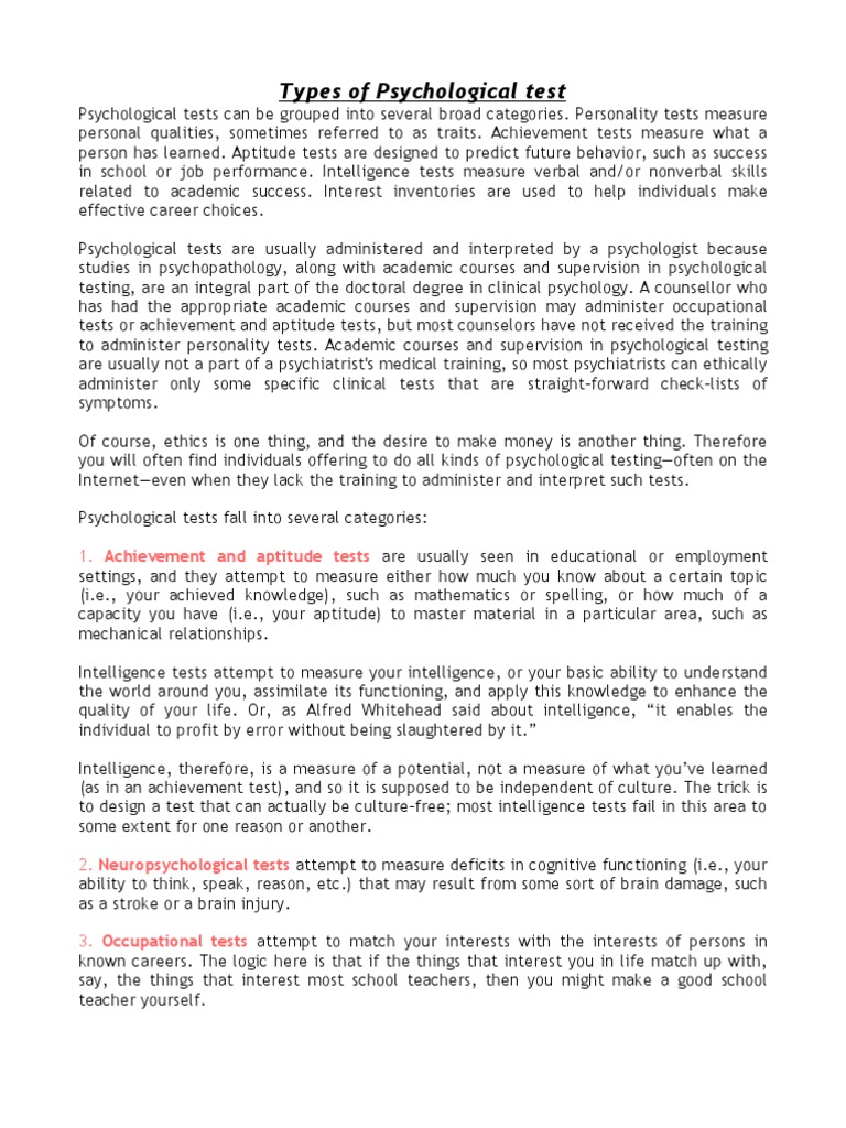 Psychological tests can be grouped into several broad categories. Personality tests measure